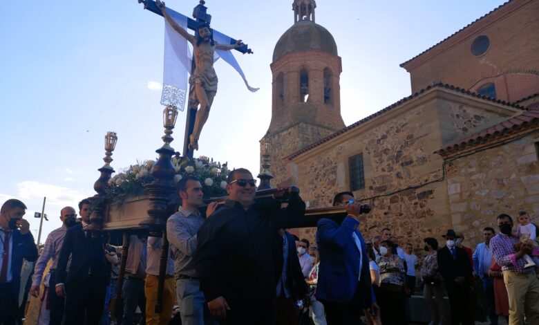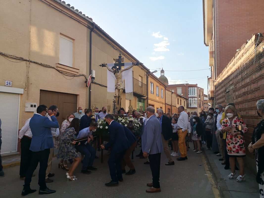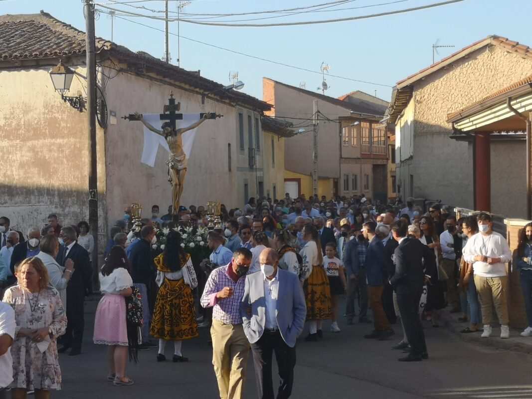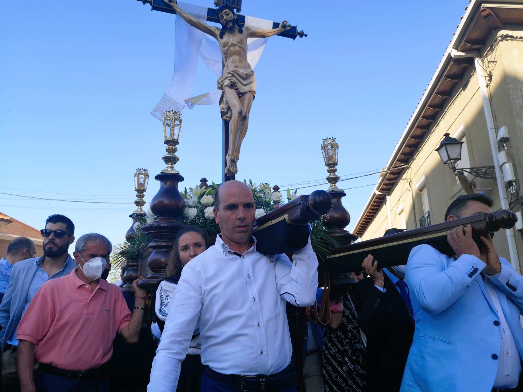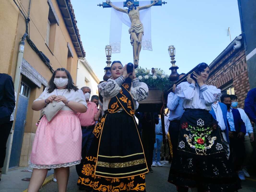 Cuando el Santísimo Cristo de la Vera Cruz salía a la calle en Santa Cristina de la Polvorosa las miradas se centraban únicamente en la bella imagen escultórica, como imán de devociones, cruzando el pórtico de la iglesia. El repique de campanas ni siquiera asustó a las palomas revoloteando por la cuadrangular torre del templo parroquial. Incluso el astro sol se atrevía a prolongar su estancia permitiendo que el ocaso de este lunes 9 de mayo se hiciera permanente, al menos mientras el Bendito Cristo de la Vera Cruz permaneciese en las calles.