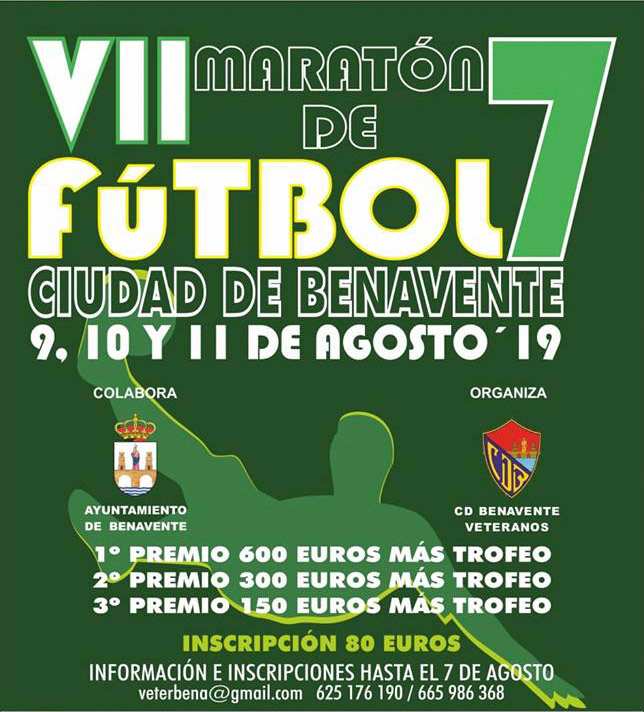 Hasta el 7 de agosto están abiertas las inscripciones para la celebración de la séptima edición del Maratón de Fútbol 7 organizado por la Asociación de Veteranos del C.D Benavente y programado para los días 9, 10 y 11 de agosto.