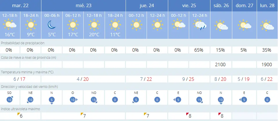 El miércoles y jueves tendremos cielos poco nubosos y despejados, con temperaturas que rondarán entre los 16°C y los 20°C. Será un día perfecto para disfrutar de las actividades al aire libre.