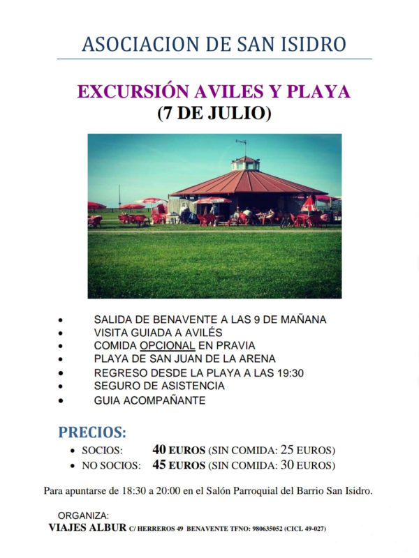La Asociación de vecinos de San Isidro han organizado una excursión a Avilés y Playa este 7 de Julio, la cual incluye:
