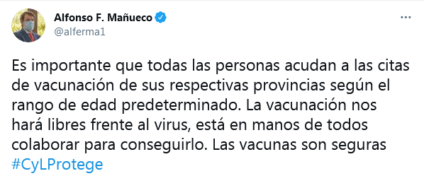 “Es importante que todas las personas acudan a las citas de vacunación de sus respectivas provincias según el rango de edad predeterminado. La vacunación nos hará libres frente al virus, está en manos de todos colaborar para conseguirlo. Las vacunas son seguras #CyLProtege”, escribe hoy en su perfil de Twiter.