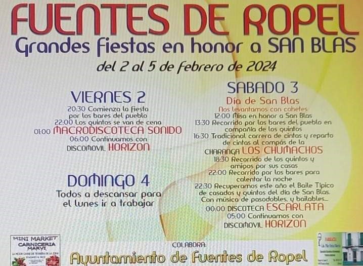 La jornada festiva de San Blas se abre al mediodía con una misa y posterior recorrido de la mocedad por los bares de Fuentes de Ropel. Para las cuatro y media de la tarde está prevista la tradicional carrera de cintas animada con la charanga Los Chumachos.