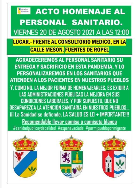 La asociación Iniciativas Ropelanas de Fuentes de Ropel, con el apoyo de los tres Ayuntamientos respectivos, ya que el facultativo médico atiende a los tres pueblos, ha convocado a los vecinos a rendir homenaje a los sanitarios. La asociación cultural recomienda acudir a la concentración frente al consultorio médico vestidos con una camisa o camiseta blanca a las 12:00 horas de este 20 de agosto «para agradecer al personal sanitario su entrega y sacrificio en esta pandemia».