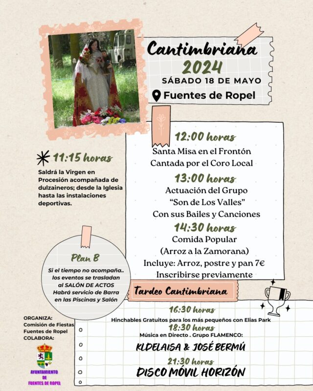 La localidad de Fuentes de Ropel celebra este sábado 18 de mayo la romería en honor a la Virgen de la Cantimbriana. Aunque tradicionalmente, hasta hace casi cuatro décadas, se venía celebrando la fiesta coincidiendo con el lunes de Pentecostés, en los últimos años se comenzó a celebrar el domingo, pero en esta ocasión la Comisión de Fiestas, con la colaboración del Ayuntamiento, ha decidido organizarla este sábado con el fin de que los vecinos residentes fuera puedan participar y no tener que partir deprisa el domingo a sus lugares habituales de residencia. Esta es la explicación ofrecida a Benavente Digital justificando la organización del programa mañana sábado 18 de mayo.