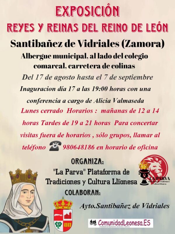 La exposición itinerante Reyes y Reinas del Reino de León mantiene abiertas sus puertas hasta el 7 de septiembre, en el albergue de Santibáñez de Vidriales, en horario de las 12:00 a las 14:00 horas y de las 19:00 horas a las 21:00 horas. Los lunes se encuentra cerrada.