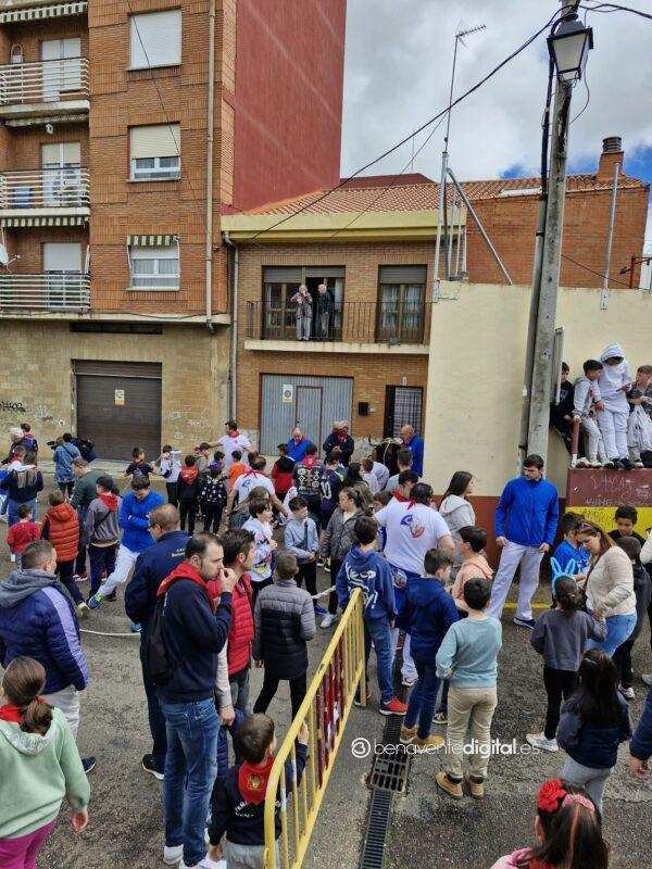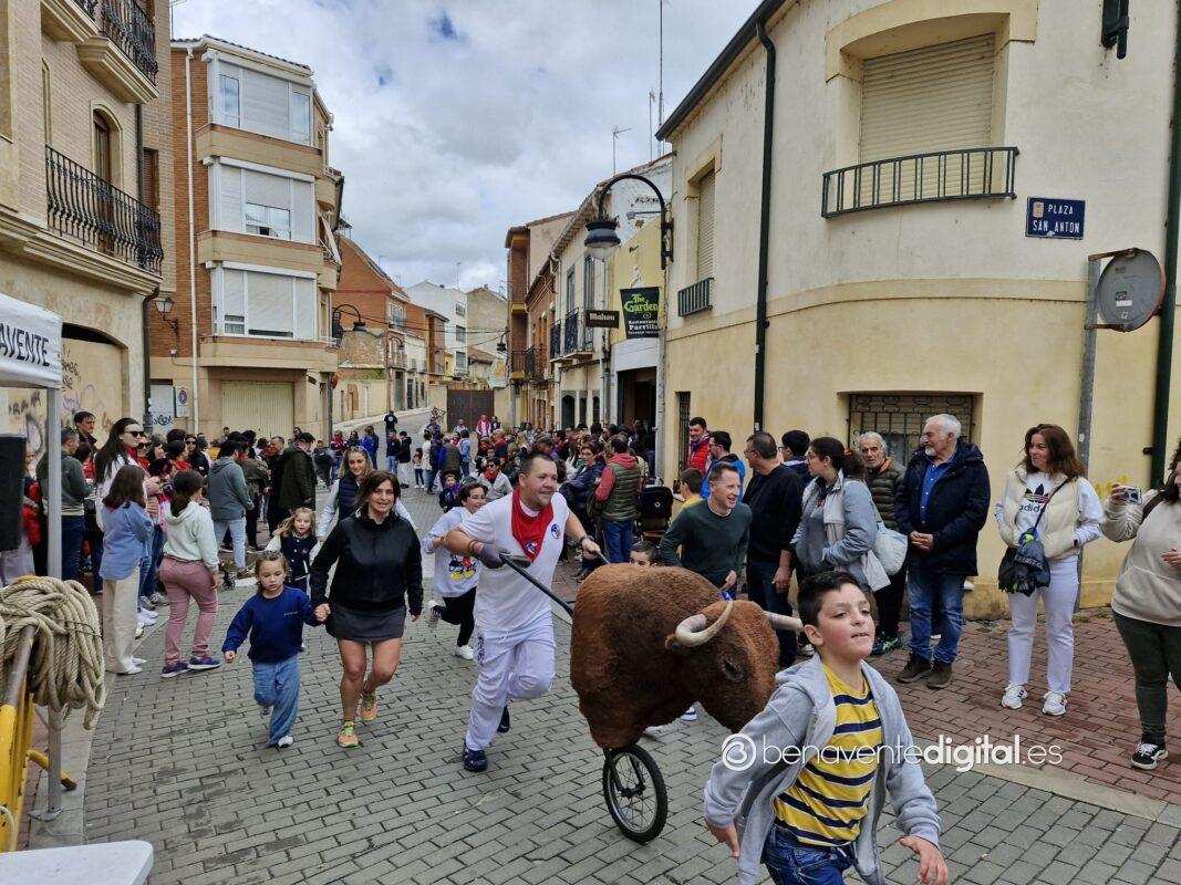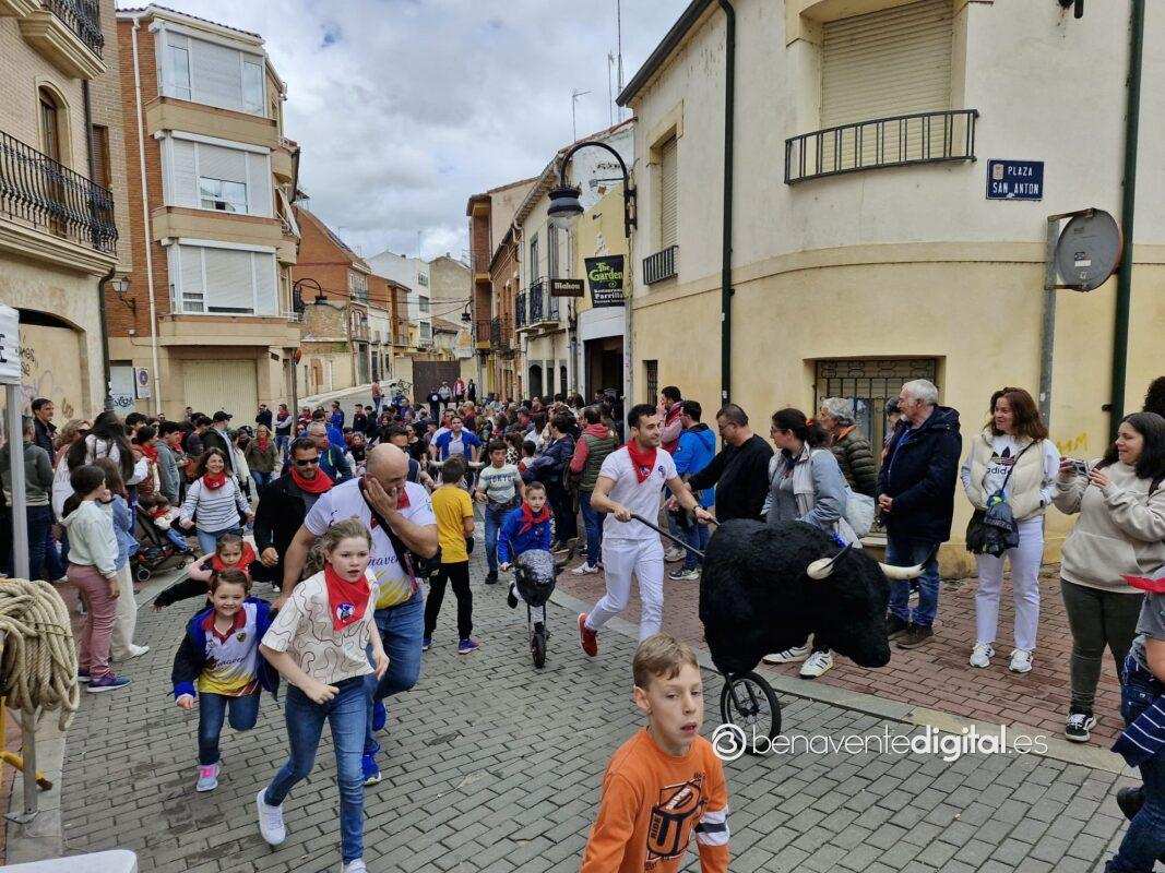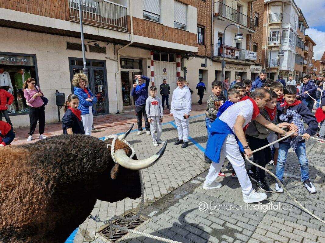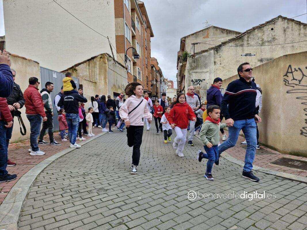 En esta jornada se ha continuado formando a los niños y jóvenes en la correcta manera de correr el toro de nuestra ciudad. Para ello se ha realizado una carrera siguiendo el recorrido tradicional del Toro Enmaromado con unos carretones hiperrealistas del animal. Los niños, agarrados de la maroma, han recorrido las calles de Benavente en un ensayo de lo que les espera a nuestros vecinos el próximo 29 de mayo.