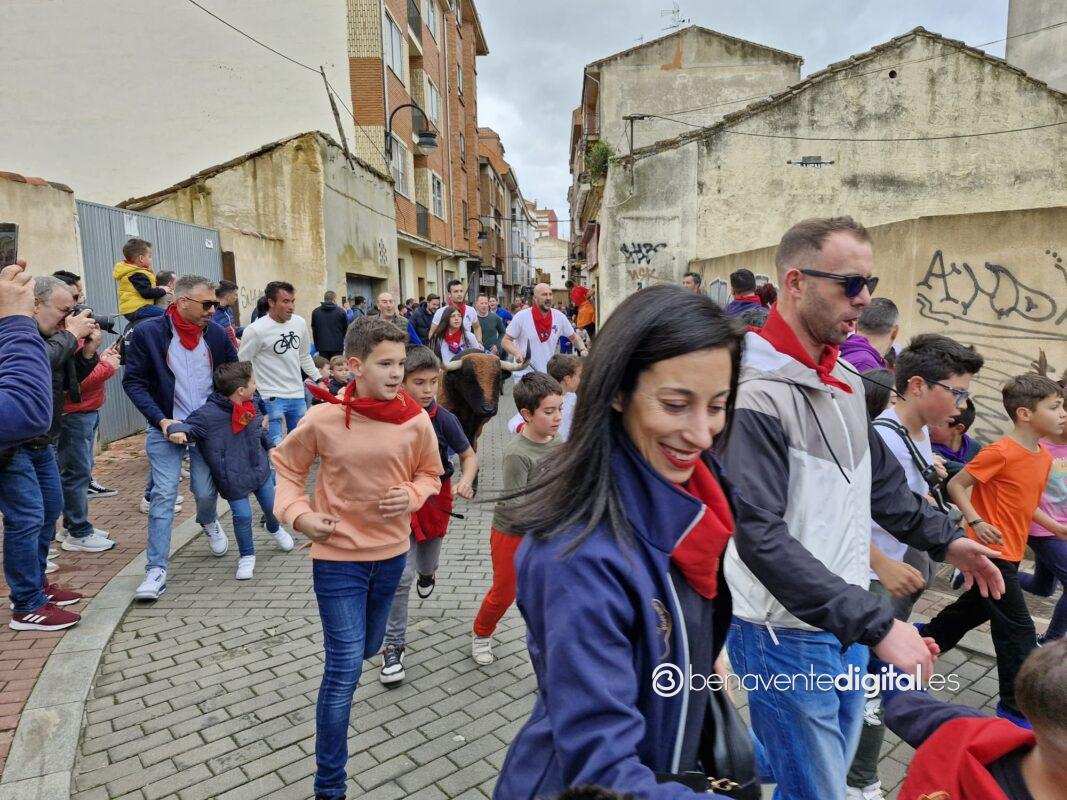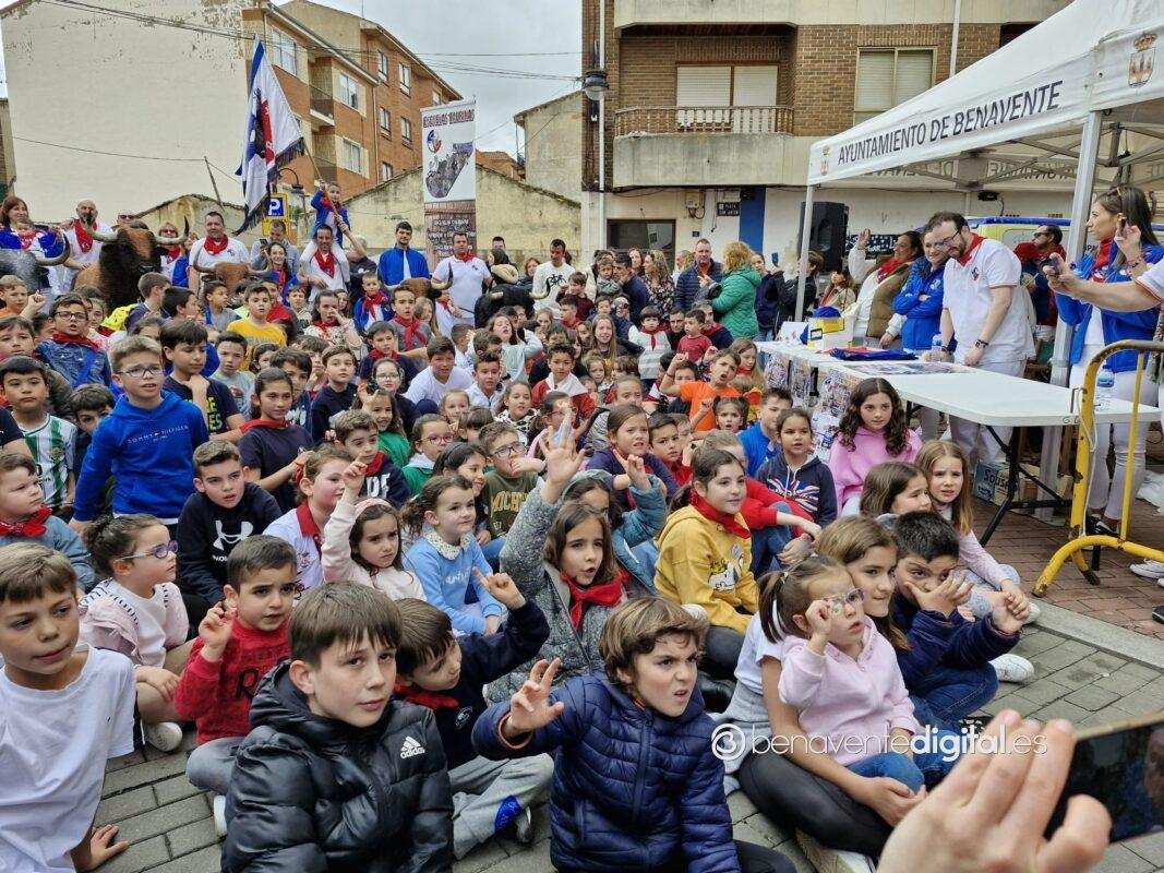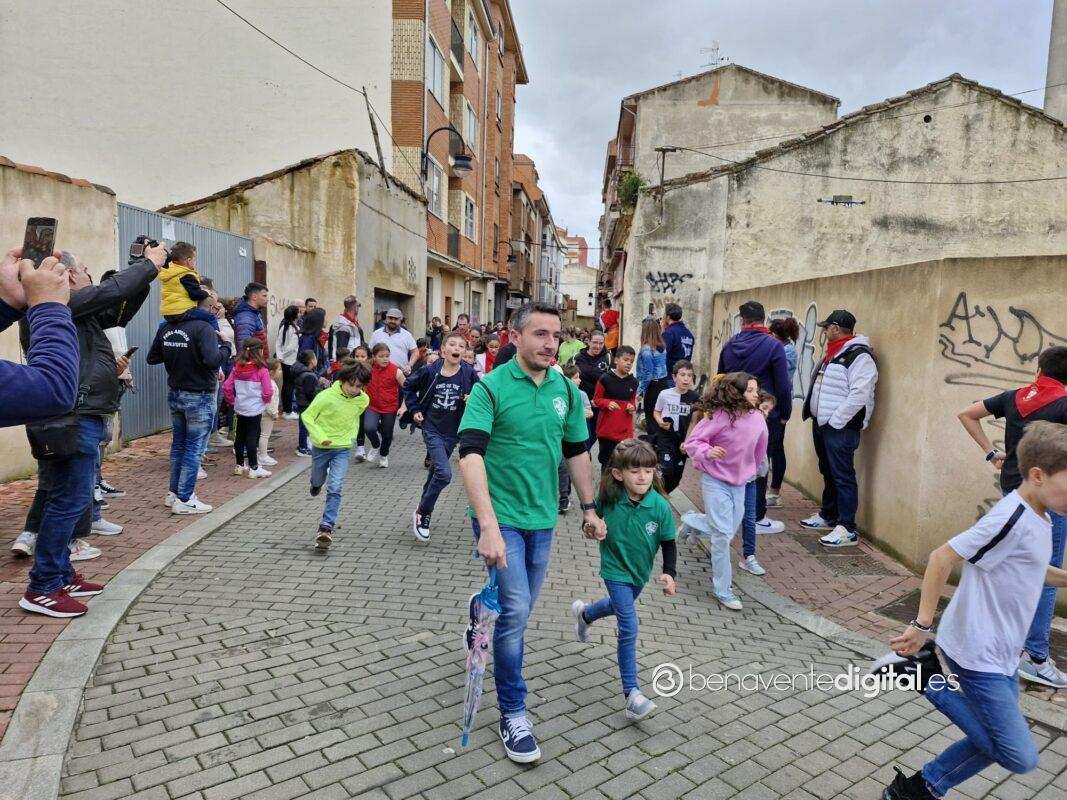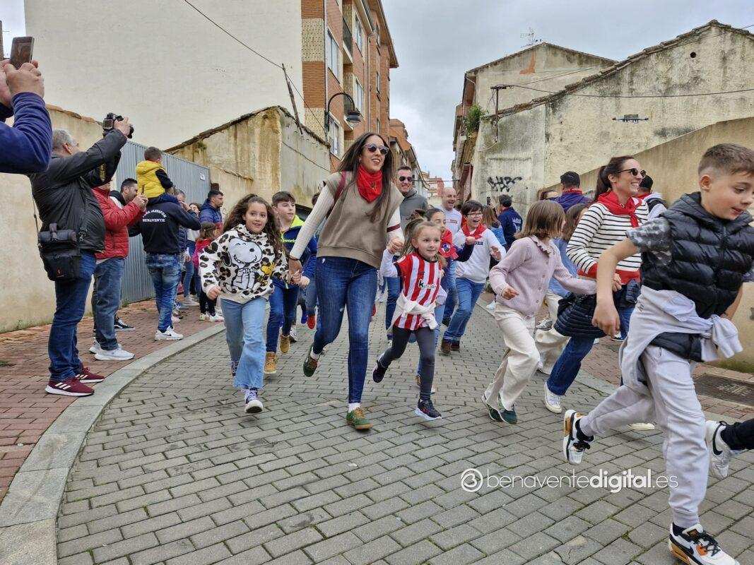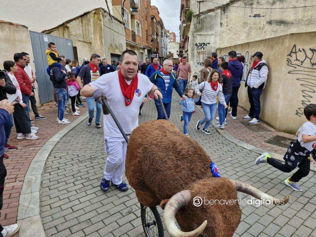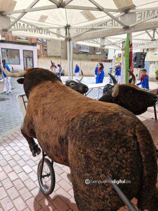 En esta jornada se ha continuado formando a los niños y jóvenes en la correcta manera de correr el toro de nuestra ciudad. Para ello se ha realizado una carrera siguiendo el recorrido tradicional del Toro Enmaromado con unos carretones hiperrealistas del animal. Los niños, agarrados de la maroma, han recorrido las calles de Benavente en un ensayo de lo que les espera a nuestros vecinos el próximo 29 de mayo.