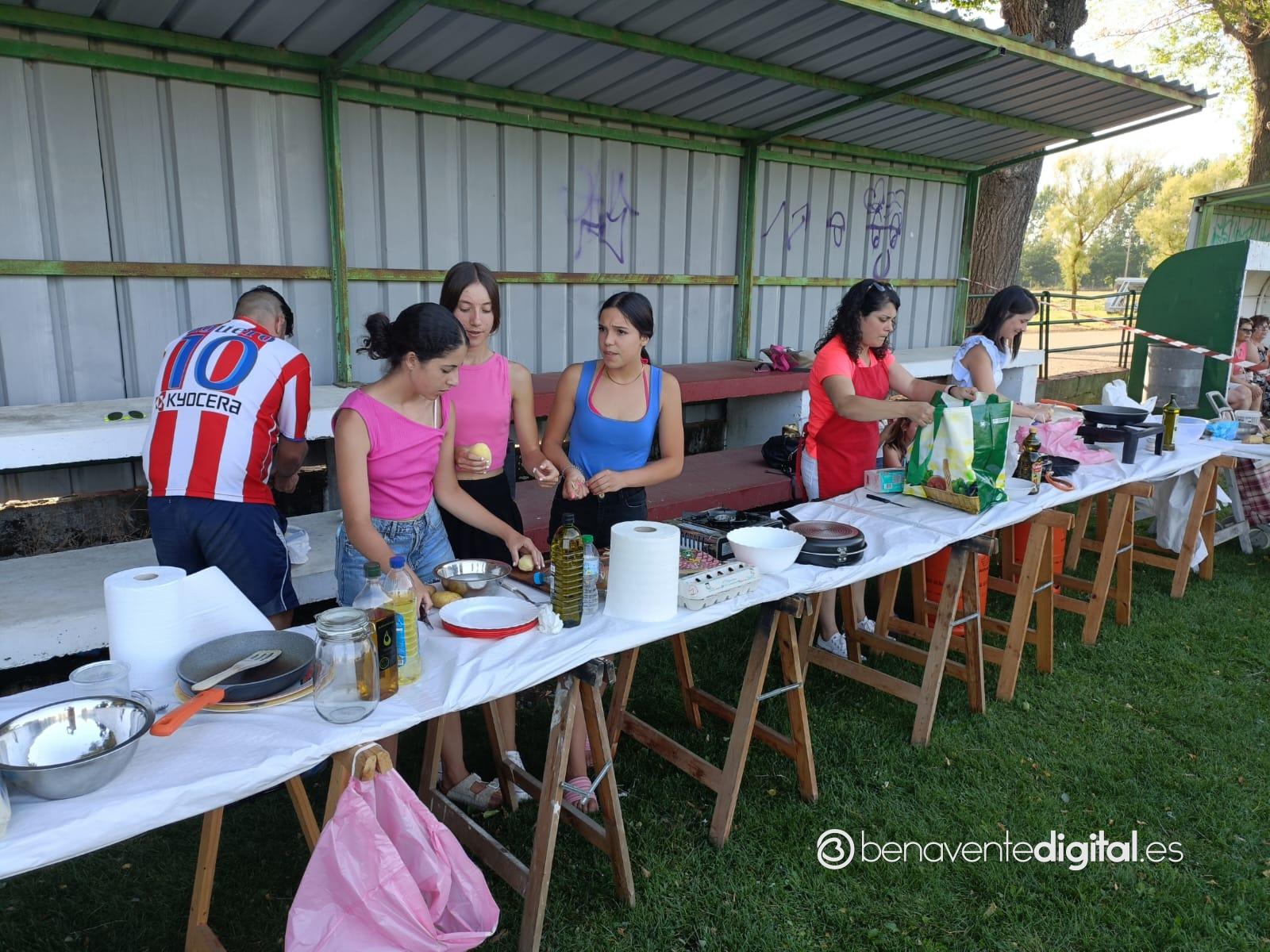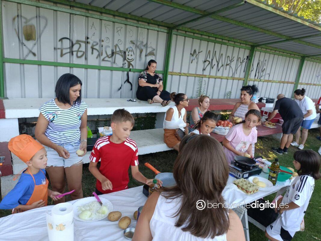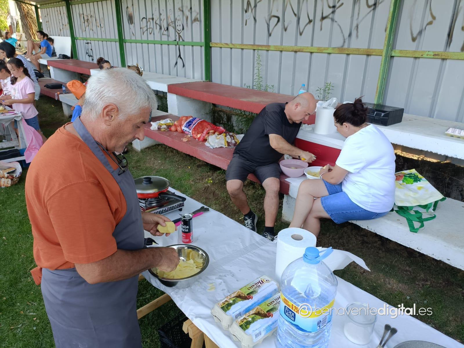 Niños y mayores, convertidos en chefs de la ribera del Tera, por eso del privilegiado escenario a la sombra del graderío del campo de fútbol, lograron brindar simpáticas escenas con el delantal.
