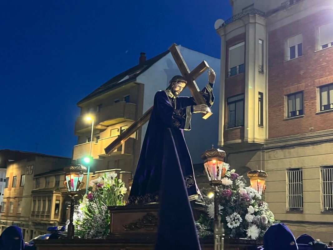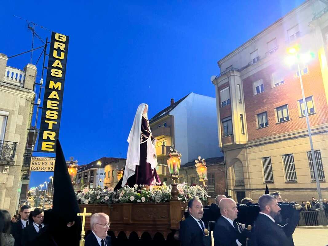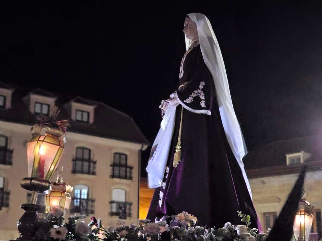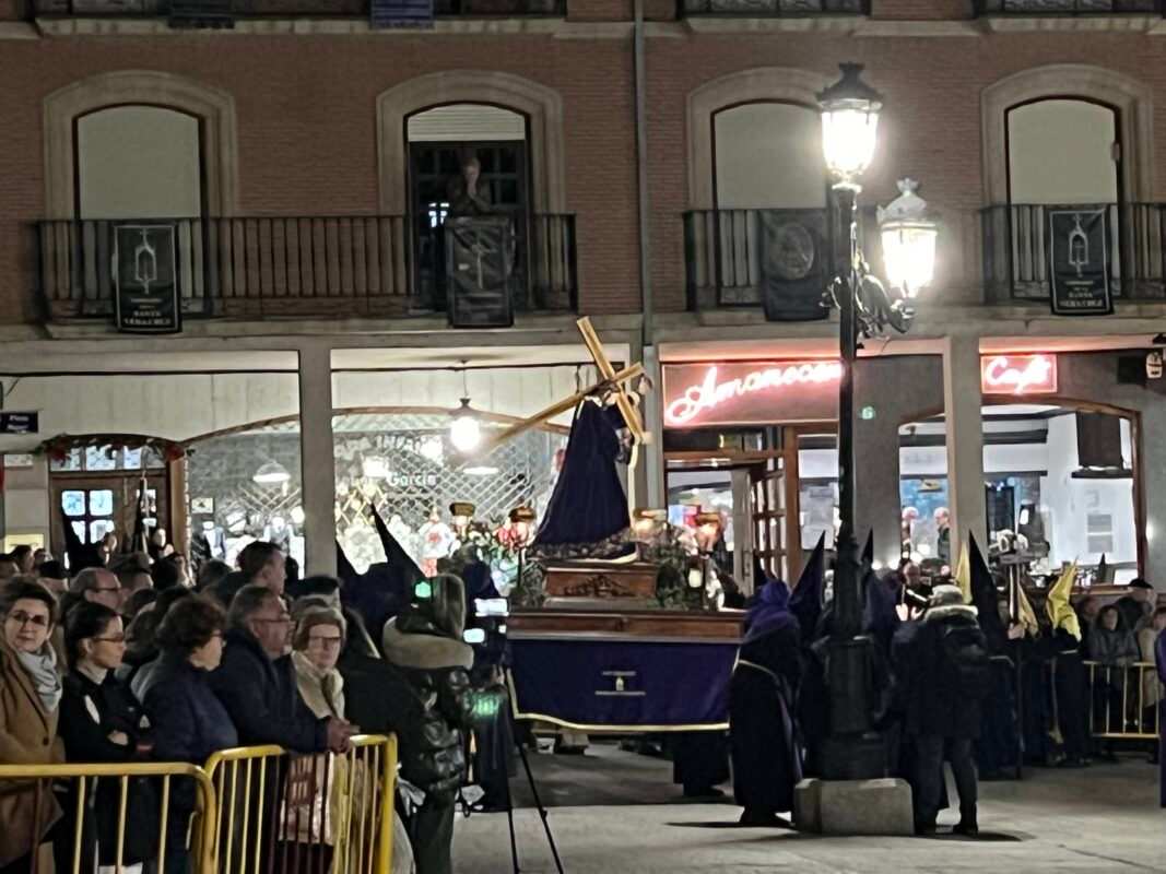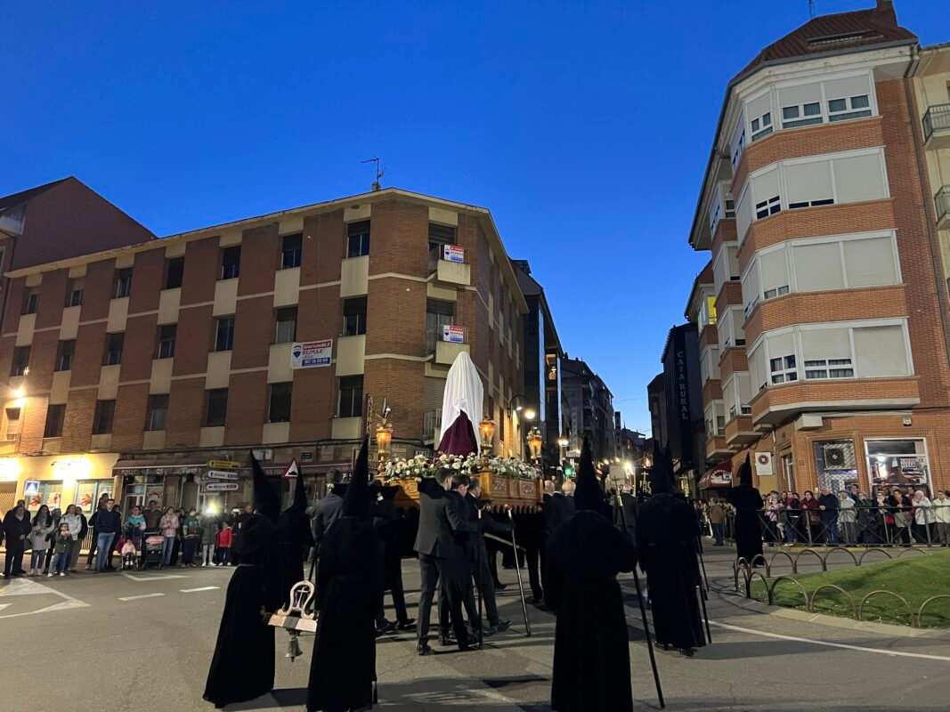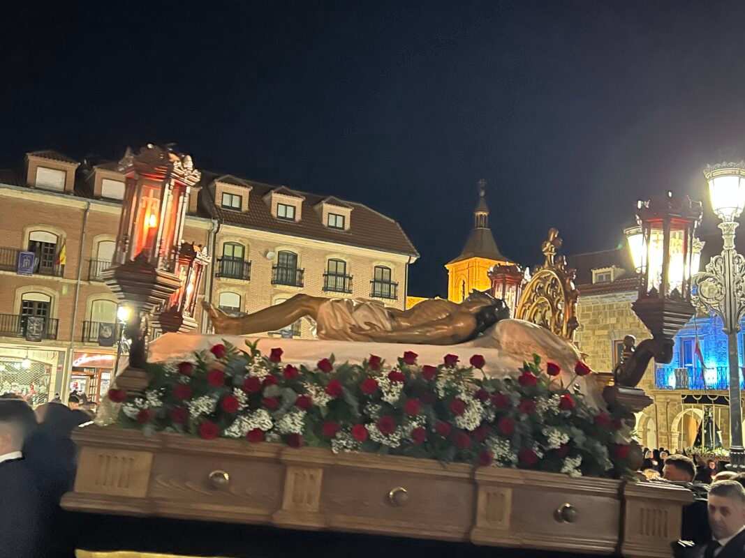 Partiendo desde La Ermita de la Soledad por calle Santa Cruz y calle Encomienda, los pasos llegaron a la plaza Mayor en la que la Virgen de la Soledad realizó venias a la Imagen de Jesús con la Cruz. Tras este momento de emoción y recogimiento, la procesión se dividió en dos: la Imagen de Jesús con la Cruz a cuestas y la Imagen de la Soledad se dirigieron hacia la Iglesia de San Juan del Mercado; continuando el resto de la Procesión por calle Cortes Leonesas, calle de los Herreros y finalizando en la Iglesia de Santa María la Mayor.