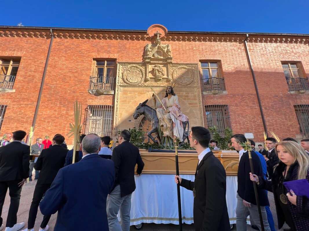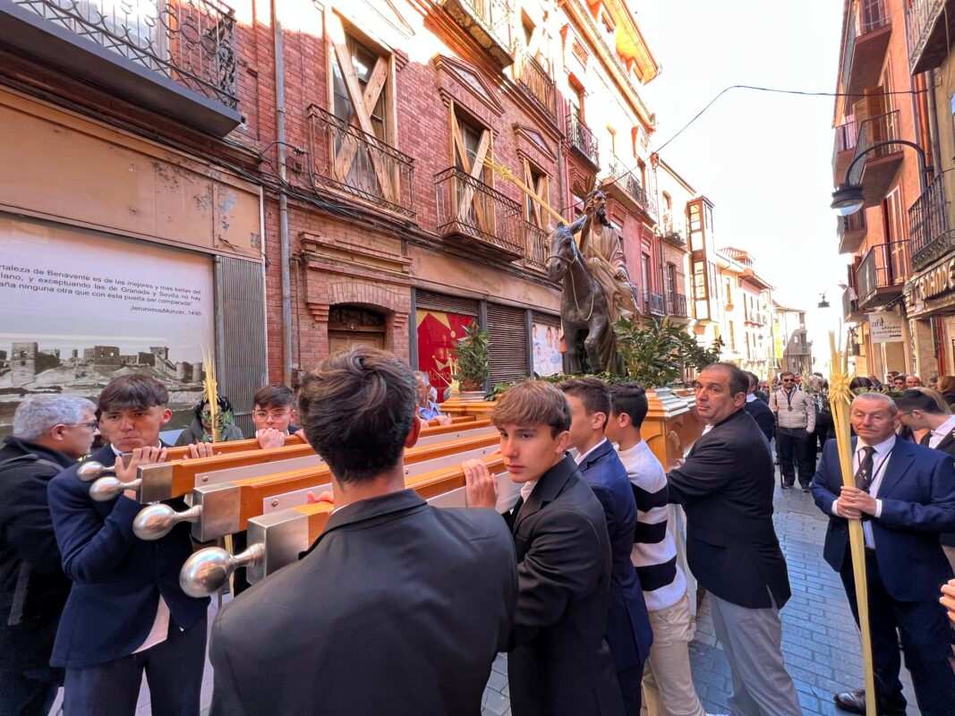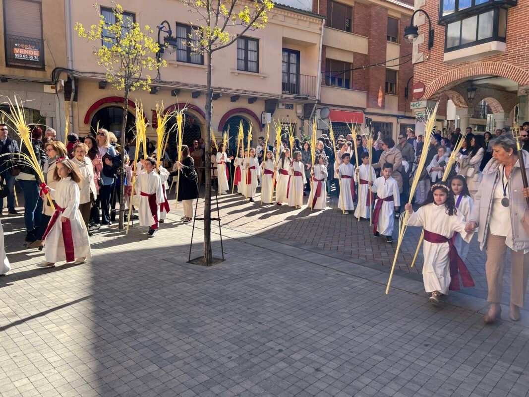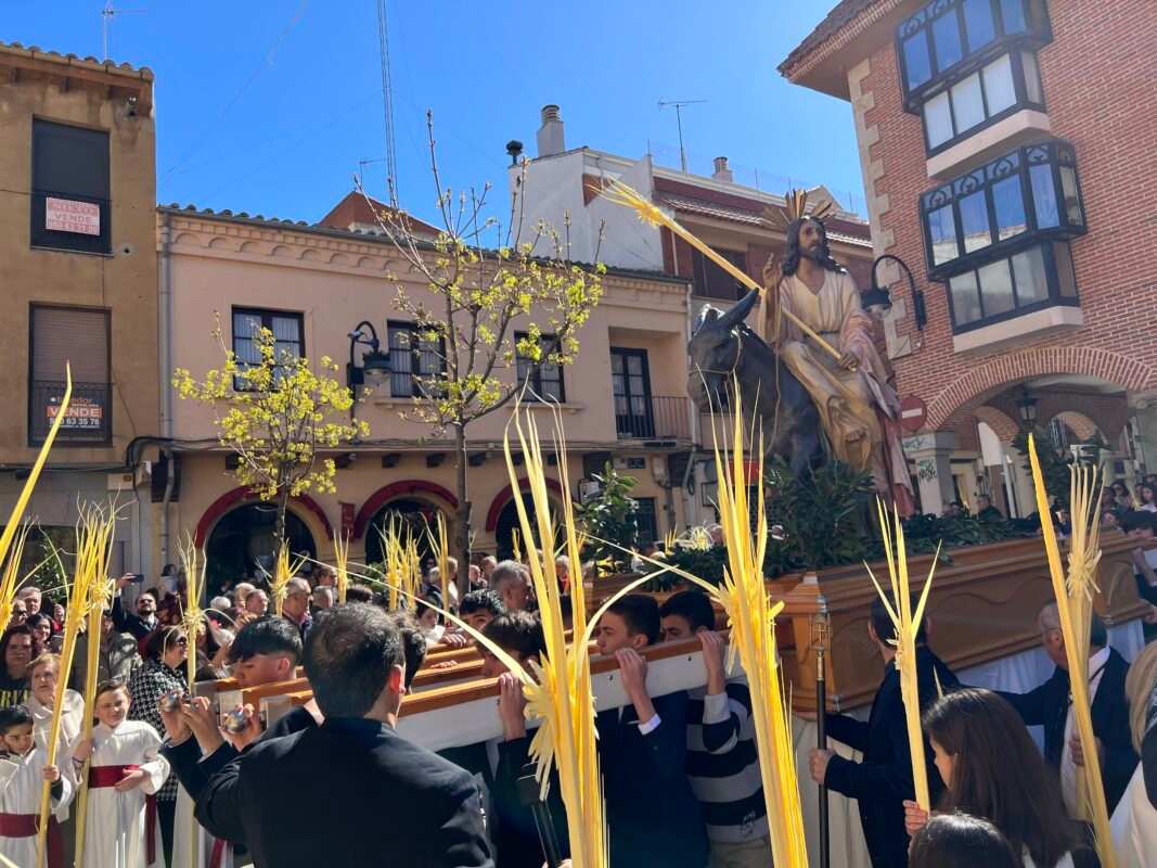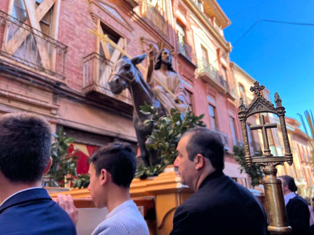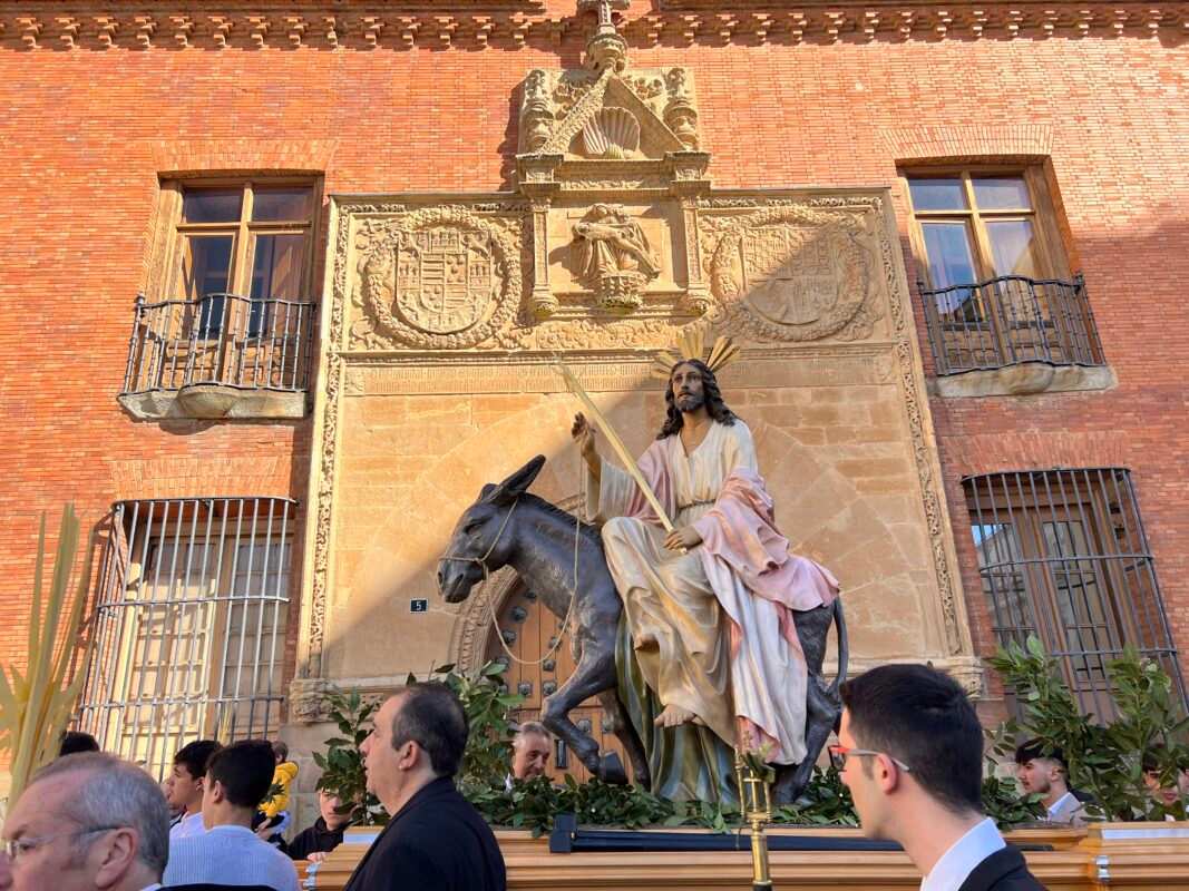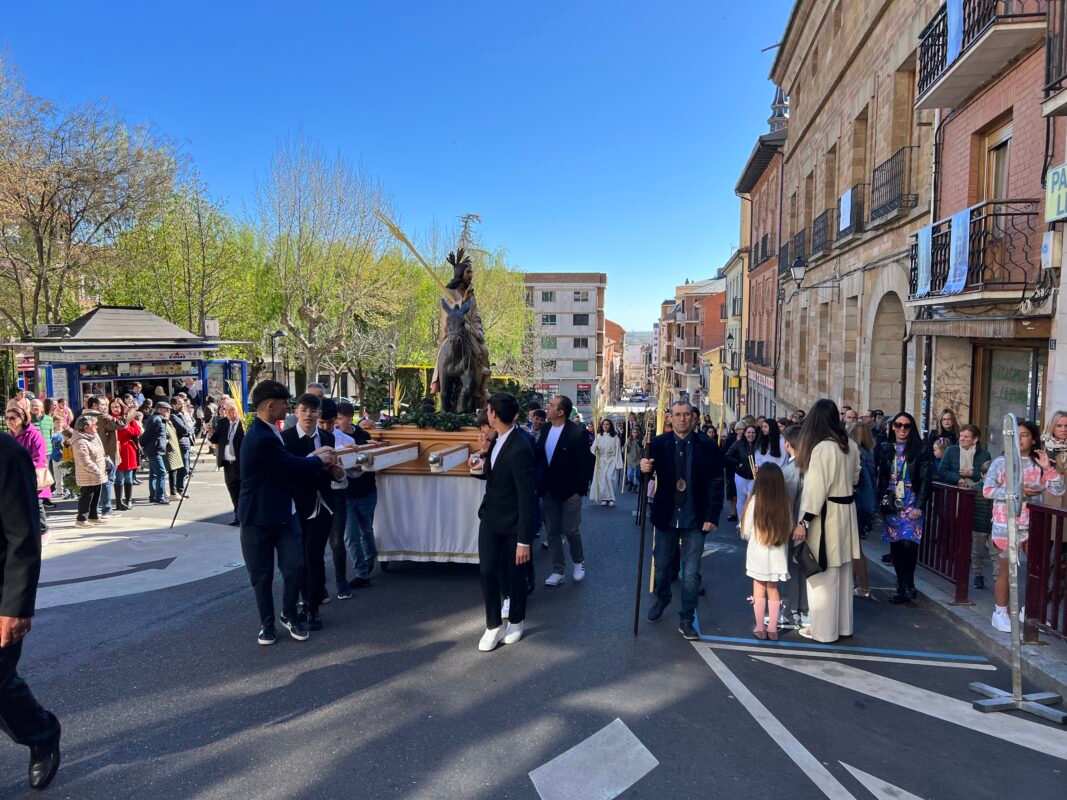 «Partiendo de la Ermita de la Soledad el Paso de Jesús en la Borriquilla, representando la Entrada Triunfal en Jesuralén, acompañado por los niños de las cinco parroquias, portadores de Palmas, pertenecientes a la cofradía de nuestro Padre Jesús a su Entrada en Jesuralén. Recorriendo la calle Santa Cruz, plaza del Grano, calle la Rúa hasta la Iglesia de Santa María la Mayor, donde se ha celebrado la Misa Solemne, regresando más tarde a la Ermita de la Soledad con el recorrido inverso.