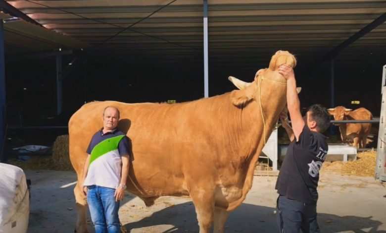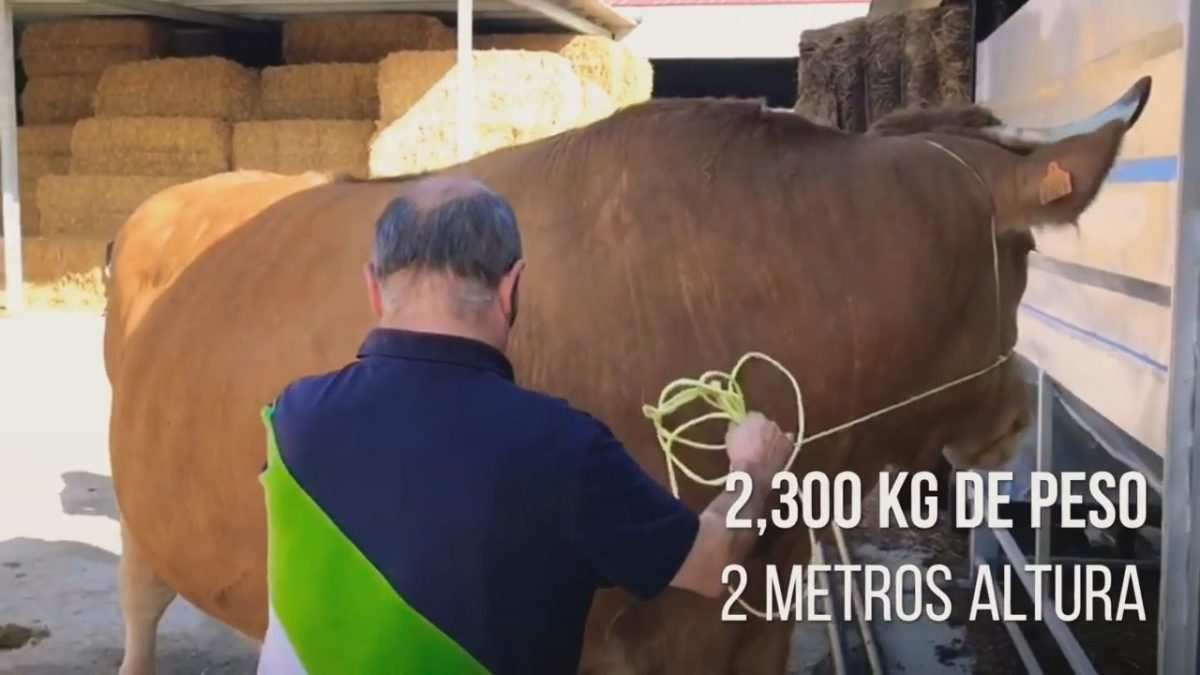 De nombre ‘Goliat’, este buey pesa más de 2.000 kilos y roza los dos metros de altura. A sus virtudes morfológicas se le une la pertenencia a una raza muy codiciada en gastronomía, la rubia gallega, cuyos ejemplares pueden llegar a pesar hasta 1.000 kilos si es hembra, o 1.800 kilos si es macho.