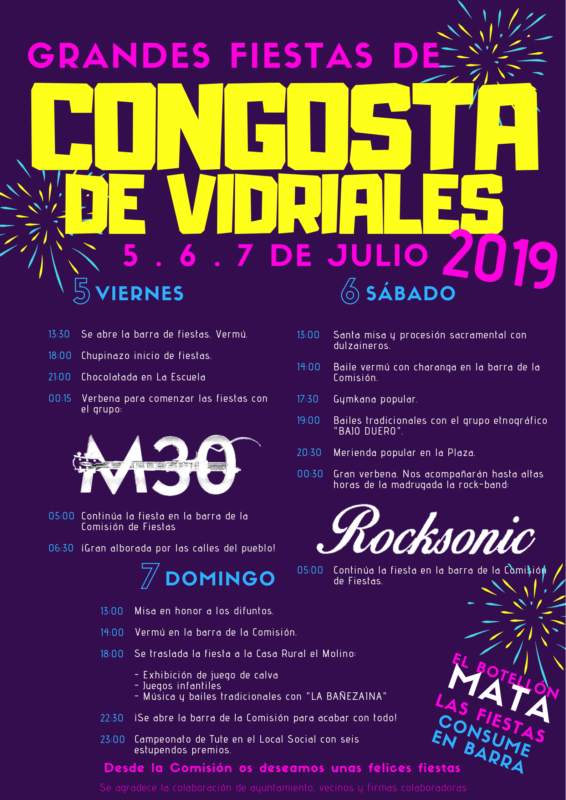 Este fin de semana se celebran las fiestas de Congosta de Vidriales. Por primera vez, los más jóvenes del pueblo han organizado una comisión de fiestas que se encargará de la barra durante el fin de semana. Además, tanto ellos como el ayuntamiento han preparado múltiples actividades incluyendo dos verbenas la noche del viernes y la del sábado con las que esperan que el pueblo se llene. Por otro lado, la Asociación Cultural el Balcón de Vidriales llevará a cabo la exhibición etnográfica y la merienda el Local Social.
