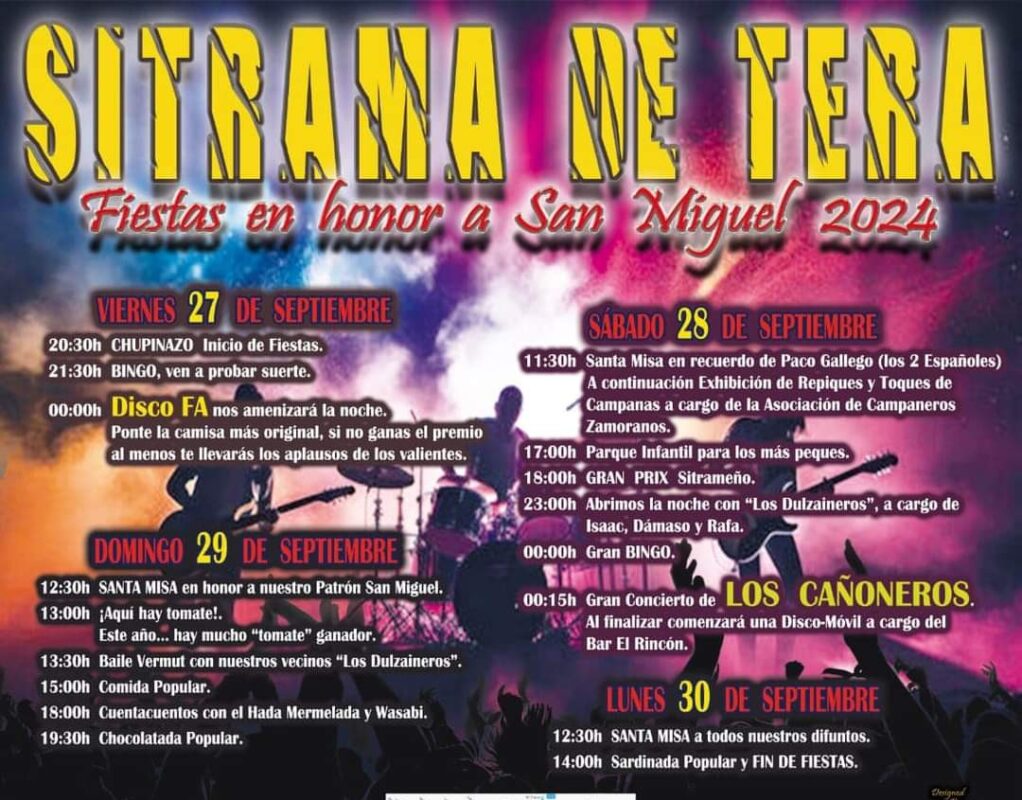 La localidad de Sitrama de Tera rendirá homenaje al fallecido vecino Paco Gallego, del dúo Los Dos Españoles, en la programación de los festejos patronales en honor a San Miguel Arcángel. Desde el viernes 27 al lunes 30 de septiembre se extiende el programa que incluye el tributo al estimado vecino, artista de la música, fallecido el 17 de noviembre 2022. Será el próximo sábado 28, a las 12:30 horas, cuando se celebre una misa en su memoria y a continuación la Asociación de Campaneros Zamoranos ofrece una exhibición de repiques y toques de campanas. Las recreaciones infantiles de la tarde, un Gran Prix sitrameño, la actuación de los dulzaineros, Isaac (de Los Dos Españoles), Dámaso y Rafa, así como un bingo y el concierto con «Los Cañoneros», de Valladolid, conforman el programa de esta jornada.