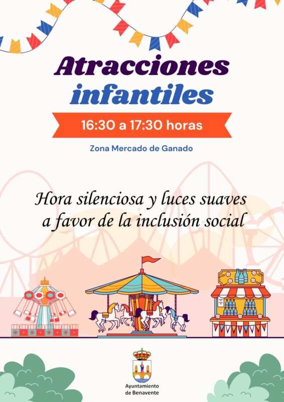 Las Concejalías de Fiestas y Bienestar Social del Ayuntamiento de Benavente informan que se ha llegado a un acuerdo con los feriantes que se instalarán en la zona del Mercado de Ganado durante las Fiestas del Toro Enmaromado, para que todos los días de apertura al público se limite el volumen y las luces de las atracciones para favorecer la inclusión de personas con discapacidad o trastornos de espectro autista o hipersensibilidad.