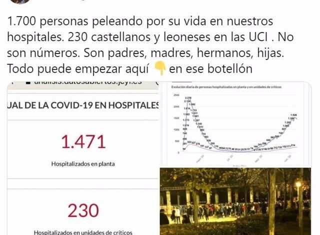 Así lo ha hecho a través de su perfil de Twitter, donde ha recordado que actualmente hay «1.700 personas peleando por su vida en hospitales» y «230 castellanos y leoneses en las UCI».