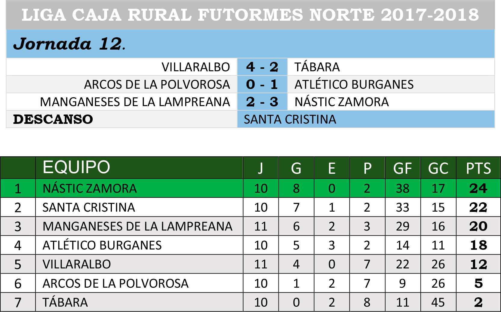 El Nástic Zamora volvió a encaramarse como líder provisional en la Liga Caja Rural Futormes grupo norte tras vencer a Manganeses de la Lampreana y aprovecharse del descanso del líder de ese momento Santa Cristina. Los cucos ahora son segundos con dos puntos menos en la clasificación.