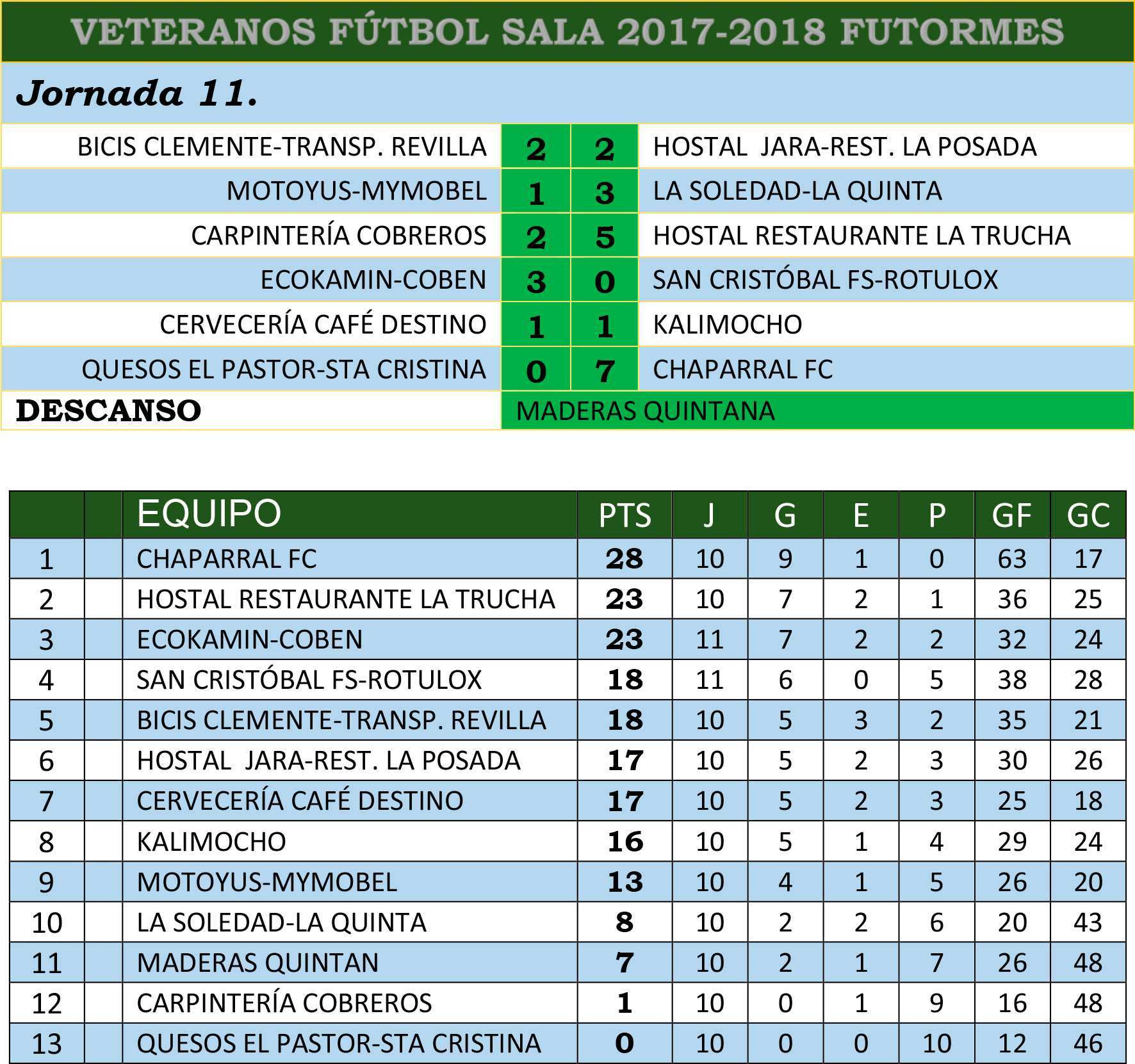 En la Liga Veteranos de Fútbol Sala el Chaparral continúa con paso firme hacia el título con la tranquilidad que le dan los cinco puntos de diferencia respecto al segundo y el tercer clasificado. No tuvo problemas para ganar al farolillo rojo en la última jornada en la que hay que destacar la victoria de La Soledad-La Quinta ante Motoyus-Mymobel.