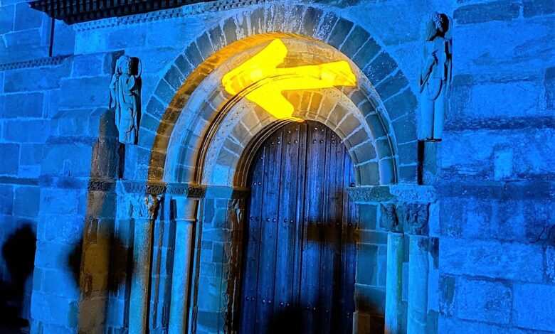 Una flecha amarilla proyectada sobre la fachada norte y sur del templo románico de Santa Marta de Tera señala el camino mozárabe sanabrés. La proyección artística luminosa, desde esta noche y hasta el 2 de enero, forma parte del proyecto «Ilumina el Camino» enmarcado en los actos de promoción del Año Jacobeo que se prolonga durante el 2022.