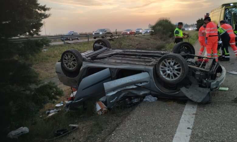 Un neumático reventado causa el vuelco de un coche, dejando a un matrimonio herido y causando gran conmoción en San Esteban del Molar
