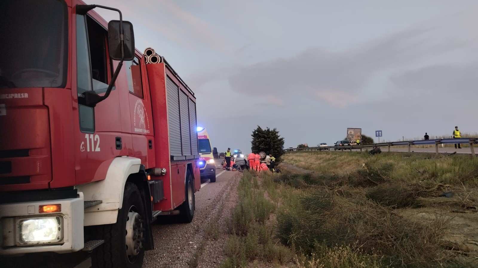 El fuerte impacto del neumático contra el turismo causó que el vehículo se desviara de su trayectoria, terminando volcado sobre el techo en la mediana de la autovía. Dentro del turismo viajaba un matrimonio de aproximadamente 60 años, quienes a pesar de la gravedad del accidente, lograron salir conscientes del vehículo.