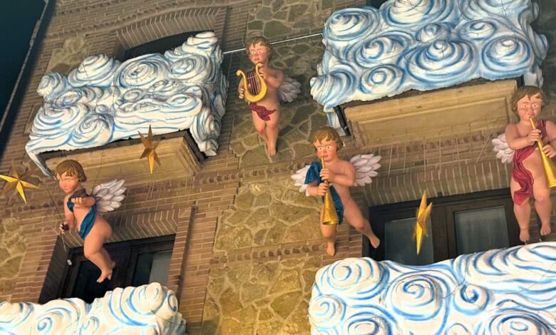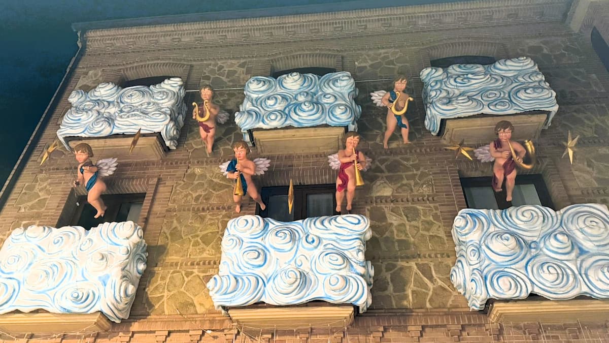 Este año, la vivienda se transforma en una escena de inspiración celestial gracias a majestuosos ángeles de gran tamaño, dispuestos con precisión en cada una de las ventanas. Las figuras, portando instrumentos musicales, evocan la imagen de un solemne coro angelical que parece derramar música sobre las calles de la ciudad.