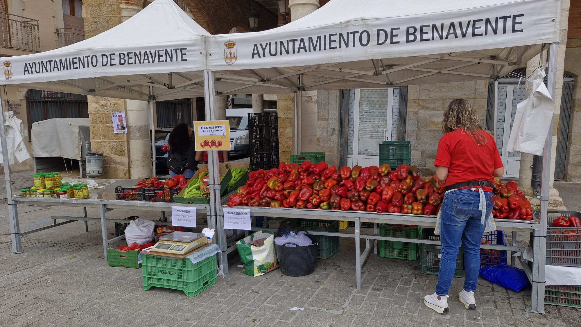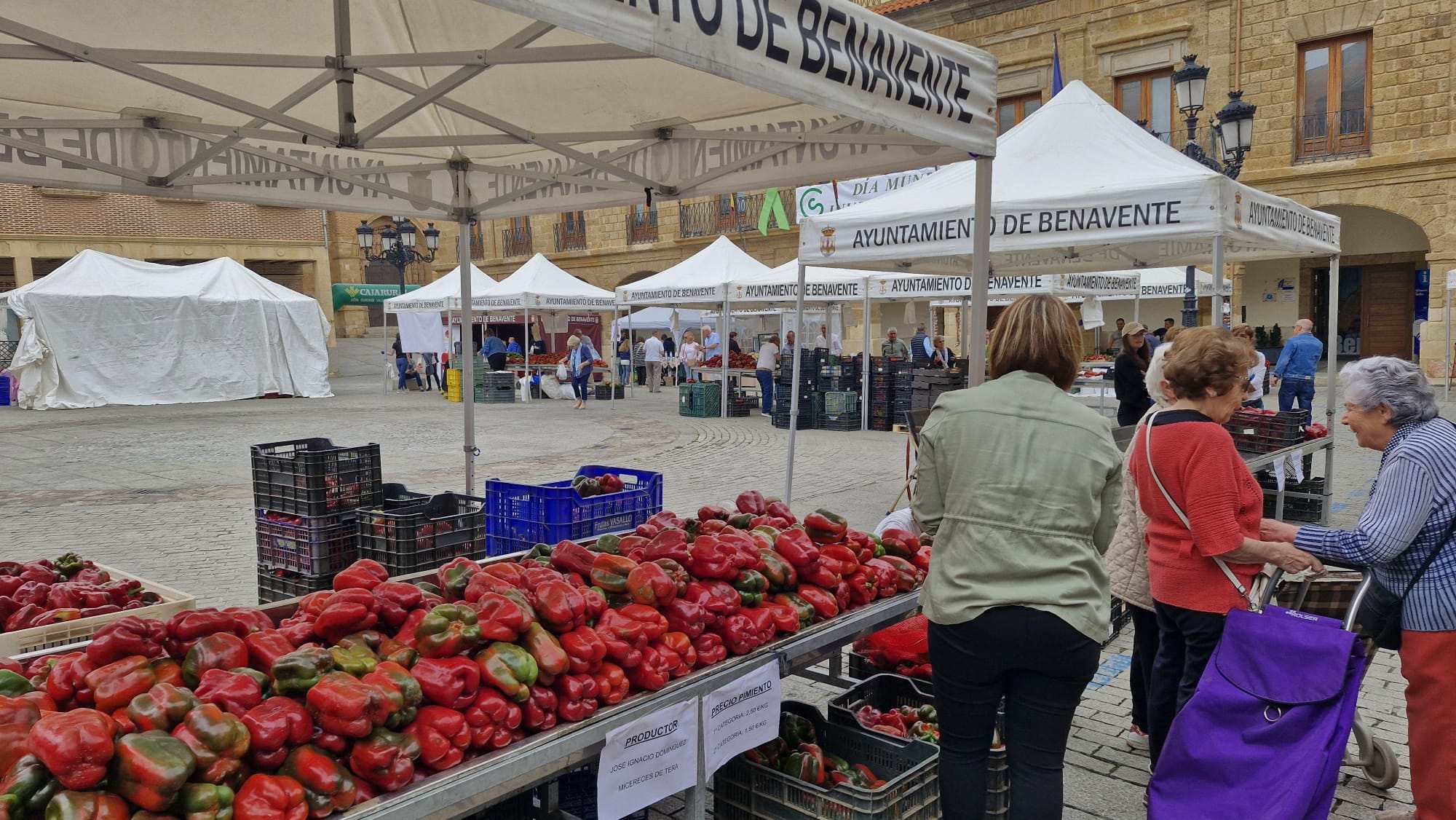 Tenderos de toda la comarca, sobre todo la del valle del Tera y de Vidriales se han congregado en la plaza mayor de Benavente con sus mejores pimientos a aprecios muy competitivos. Tales precios, comunes para todos los puestos, han sido fijados por AHURBAVE.