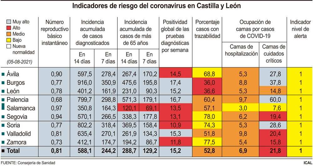 Finalmente, el número reproductivo básico instantáneo, que indica el promedio de personas que cada contagiado puede llegar a infectar, se mantiene intacto, con 0,81. La tasa más alta se observa en Salamanca, con 0,97, Segovia, con 0,94, y Ávila, con 0,9. Por debajo, Valladolid, con 0,81, en la media autonómica, seguida de León (0,78), Burgos y Soria (0,77), Zamora (0,73) y cierra el listado, Palencia, con 0,68.