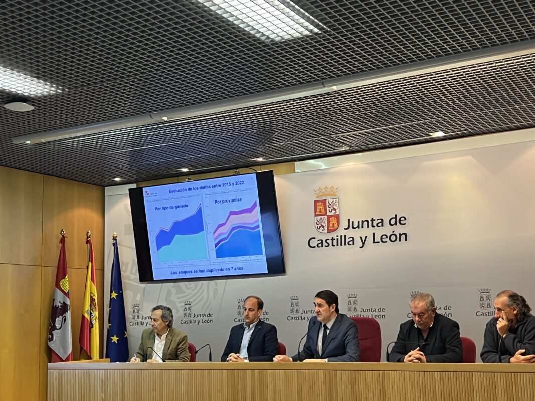 El consejero de Medio Ambiente, Vivienda y Ordenación del Territorio, Juan Carlos Suarez-Quiñones, junto con los representantes de las organizaciones profesionales agrarias ASAJA (Joaquín Pino), UCCL (Jesús Manuel González Palacín) y UPA-COAG (Aurelio González del Río), han ofrecido una rueda de prensa para informar sobre la situación del lobo en Castilla y León y denunciar el incremento acusado de los ataques de los cánidos a la ganadería desde que en 2021 el Gobierno de España impidió la gestión del lobo a las Comunidades Autónomas, dificultando incluso, hasta el extremo de imposibilitarlos prácticamente, los controles de ejemplares que la Directiva Hábitats permite incluso en el régimen de estricta protección. Asimismo, el consejero ha informado sobre la nueva Orden de la Consejería que regulará los pagos compensatorios por daños de lobo en explotaciones ganaderas de Castilla y León, por la que los pagos compensatorios se extenderán al norte del río Duero y además con carácter retroactivo desde la entrada en vigor de la inclusión del lobo al norte del Duero en el Listado de Especies Silvestres en Régimen de Protección Especial (LESPRE), el 21 de septiembre de 2021.