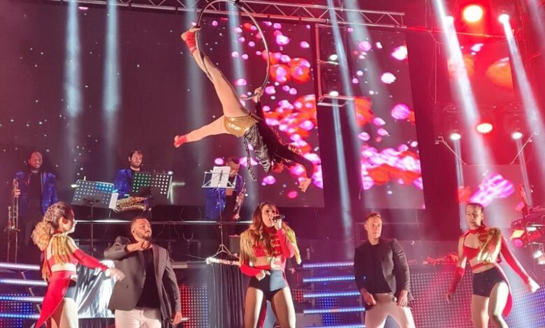‘Jaguar’ es una orquesta burgalesa conformada por once personas: tres cantantes, dos acróbatas, dos bailarinas y un cuarteto rítmico que cuenta con un escenario de 18 metros de ancho y 7,5 metros de altura, 40.000 watios de sonido y grandes pantallas LED para un espectáculo aéreo y musical de primer nivel.