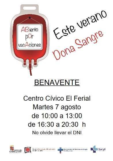 El Centro de Hemoterapia y la Hermandad de Zamora hace un llamamiento a todos los benaventanos para que ese día acudan al Centro Cívico el Ferial en horario de 10-13 y de 16.30 a 20.30 horas y que tengan en cuenta que en «El verano también se necesita sangre».