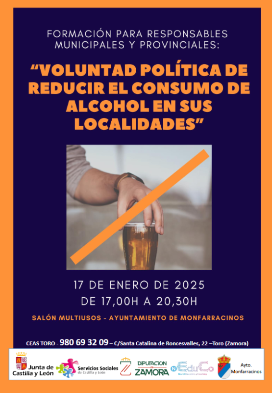 La Diputación de Zamora, a través de su Área de Bienestar Social, organiza una jornada de formación dirigida a alcaldes y concejales de la provincia con el fin de abordar la problemática del consumo de alcohol en adolescentes y preadolescentes. Este evento tendrá lugar el próximo viernes, 17 de enero, de 17:00 a 20:30 horas, en el Salón Multiusos del Ayuntamiento de Monfarracinos.