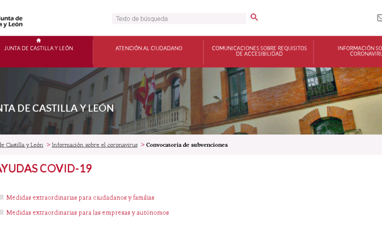 Con el objetivo de prestar una atención más eficaz al ciudadano y a las empresas de la Comunidad, la Consejería de Transparencia, Ordenación del Territorio y Acción Exterior continúa ampliando la información de interés y relevancia relacionada con la crisis sanitaria del coronavirus en la web corporativa de la Junta de Castilla y León. En esta ocasión, lo hace sumando a la web sobre el coronavirus la relación completa de medidas urgentes y extraordinarias dispuestas por la Junta de Castilla y León mediante Decreto Ley 2/2020, de 16 de abril, frente al impacto económico y social del la COVID-19 y medidas adicionales cuyo objetivo es también paliar las consecuencias de esta crisis. A partir de ahora, en dos epígrafes diferenciados ( medidas extraordinarias para ciudadanos y familias ; y medidas extraordinarias para empresas y autónomos ) se incorporarán todas las bases reguladoras y convocatorias previstas de subvenciones y líneas de ayudas, así como otras medidas adicionales de esa índole que pudieran surgir.