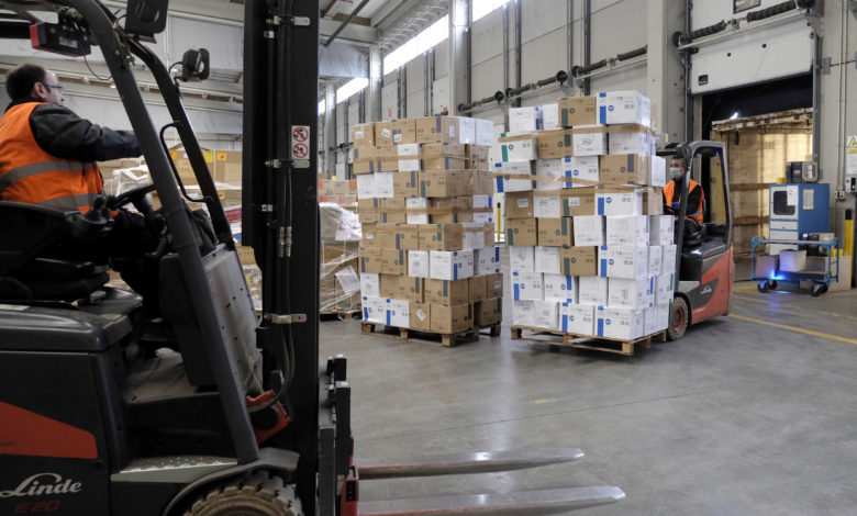 La Junta de Castilla y León mantiene a pleno rendimiento durante este período festivo su estructura logística y de transporte, y distribuye diariamente más de un millón de unidades de material y equipamiento sanitario entre los hospitales, centros de atención primaria, delegaciones territoriales y centros sociosanitarios. Más de 10 camiones trailer llevan el material desde el aeropuerto hasta el centro logístico, donde entre 15 y 20 personas realizan las tareas de entrada, clasificación y reparto, a lo que hay que sumar los dispositivos de distribución provinciales una vez llegada la mercancía.