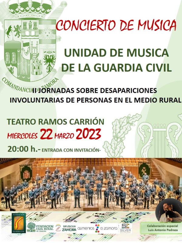 La Unidad de Música de la Guardia Civil ofrece ese miércoles 22 de marzo, a las ocho de la tarde, un concierto en el Teatro Ramos Carrión de Zamora. La actividad se enmarca en las II Jornadas sobre desapariciones involuntarias de personas en el medio rural que la Comandancia de Zamora desarrolla en la ciudad este martes y el miércoles y que tendrán como colofón este concierto de música.