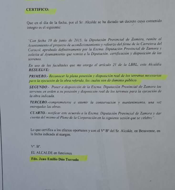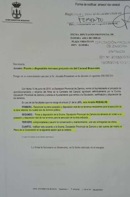 Con fecha del 10 de junio de 2015, la Diputación Provincial de Zamora remitió al Ayuntamiento el proyecto de acondicionamiento y refuerzo del firme de la Carretera del Caracol y solicitó al Ayuntamiento de Benavente que remitiera a la Diputación la certificación y disposición de los terrenos para la ejecución de las obras.