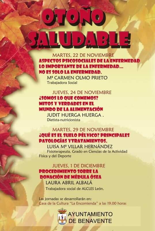 La Casa de Cultura La Encomienda de Benavente abre este martes 22 de noviembre las Jornadas del Otoño Saludable organizadas por la concejalía de Sanidad y Medio Ambiente. A partir de las siete de la tarde se desarrolla la primera sesión que viene de la mano de la trabajadora social María Carmen Olmo Prieto con la ponencia: «Aspectos psicosociales de la enfermedad. Lo importante de la enfermedad… no es solo la enfermedad».