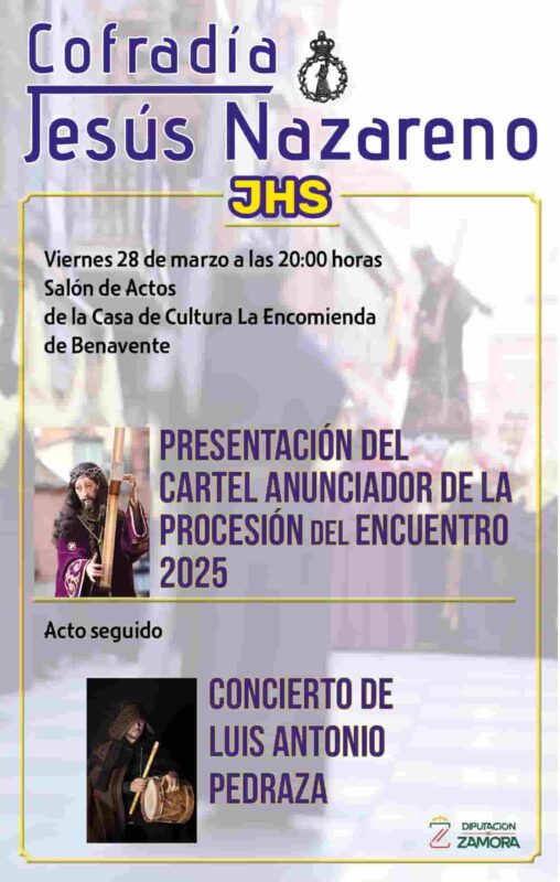El próximo viernes 28 de marzo, a las 20:00 horas, el Salón de Actos de la Casa de Cultura «La Encomienda» de Benavente acogerá la presentación del cartel anunciador de la Procesión del Encuentro de la Cofradía Jesús Nazareno para la Semana Santa 2025. Este evento cultural destacará por la actuación del reconocido músico Luis Antonio Pedraza, quien, junto al pianista Maxi Delgado, ofrecerá un concierto basado en la música tradicional zamorana.