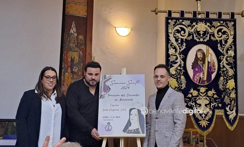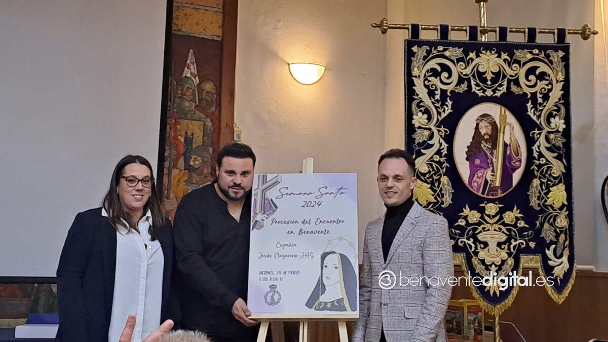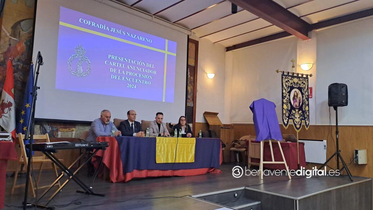 A las ocho de la tarde del viernes la cofradía Jesús Nazareno de Benavente presentaba el cartel anunciador de la procesión de El Encuentro en el salón de actos de la Casa de la Cultura La Encomienda. Ante un lleno total en la sala, se daban cita el presidente de la cofradía Jesús Nazareno, Fran Rebordinos, la autoral del cartel anunciador, Eva Blanco y los representantes municipales José Manuel Salvador, diputado de Hacienda y concejal del ayuntamiento de Benavente y Eugenio Blanco, primer teniente de alcalde y concejal de obras.