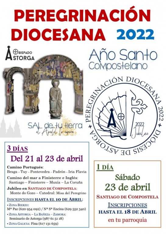 La Delegación Episcopal de Peregrinaciones de la Diócesis de Astorga organiza una peregrinación a Santiago de Compostela con un calendario de dos modalidades. Una jornada única durante el sábado 23 de abril y una peregrinación de tres días que tendrá lugar en las jornadas del 21, 22 y 23 de abril.