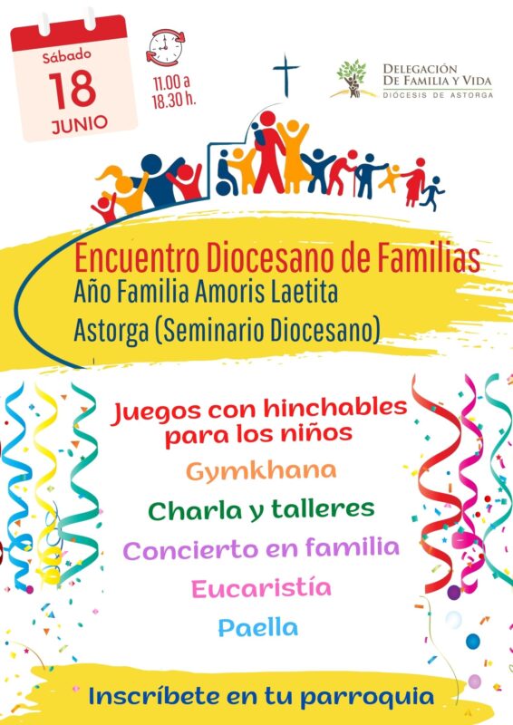 La Diócesis de Astorga organiza el 18 de junio un encuentro de familias con un abanico de actividades distintas para niños, adolescentes y jóvenes, y adultos. Este encuentro organizado por la delegación de Familia y Vida se celebra en el Seminario durante la jornada del sábado 18 de junio a partir de las once de la mañana y hasta las seis y media de la tarde.