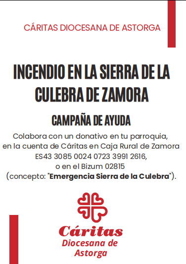 «En la Diócesis y Cáritas Diocesana de Astorga compartimos la tristeza y la angustia por el reciente incendio producido en la Sierra de la Culebra y el Valle del Tera en la provincia de Zamora, que ha quemado más de 30.000 hectáreas y lo convierte en uno de los más devas tadores de nuestro país. Y nos unimos al sentimiento de los habitantes de los pueblos que lo han sufrido». Así refiere un comunicado remitido desde la diócesis.