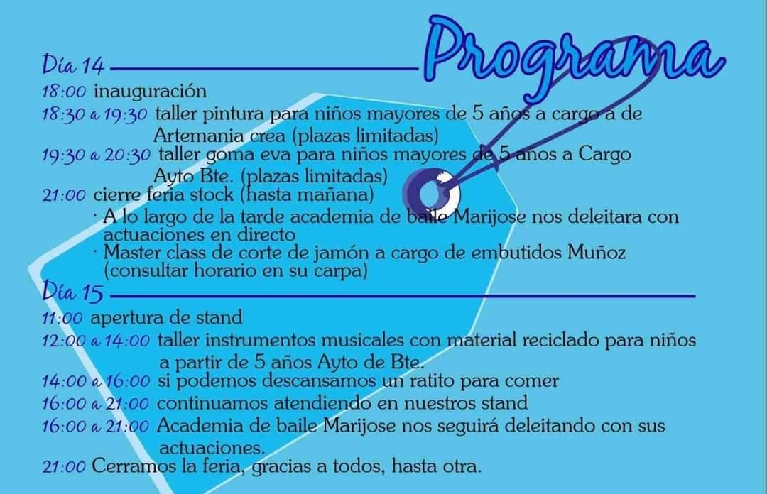 La feria comenzará el próximo sábado, 14 de mayo a partir de las 18:00 horas y contará en su jornada de tarde con un taller de pintura y un taller de Goma Eva para niños y niñas mayores de 5 años. Durante la jornada, la academia de baile Marijose deleitará al público que se acerque a la Plaza Mayor con actuaciones en directo y Embutidos Muñoz ofrecerá una clase con un cortador de jamón profesional en su carpa.