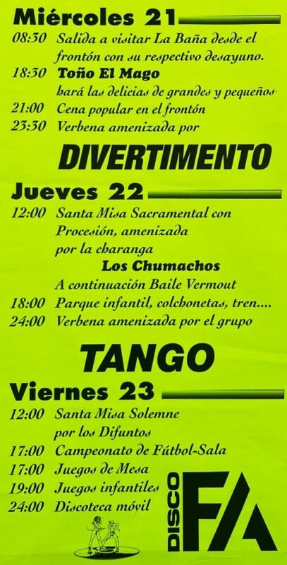 El viernes 23 se clausura el programa festivo con una misa de difuntos, un campeonato de fútbol-sala, juegos de mesa, juegos infantiles y la sesión de baile con la «DiscoFa«