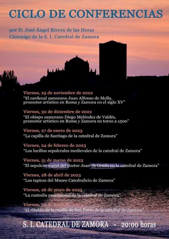 Desde este viernes 25 de noviembre y durante los últimos viernes de cada mes el canónigo y experto en arte y patrimonio, José Angel Rivera, será el encargado de las conferencias sobre temas tan relevantes en la historia y el patrimonio de la Seo como la figura del purpurado zamorano Juan Alfonso de Mella quien fuera promotor artístico en Roma y en Zamora en el siglo XV. A esta charla le siguen otras más como la figura del prelado zamorano Diego Meléndez Valdés,coetáneo del purpurado Alfonso de Mella o la capilla de Santiago, los lucillos sepulcrales medievales, el sepulcro mural del doctor Juan de Grado, los tapices del museo catedralicio, la Custodia procesional de la catedral, para finalizar el viernes 30 de junio con la conferencia sobre el retablo de la capilla de San Pablo de la Seo zamorana.