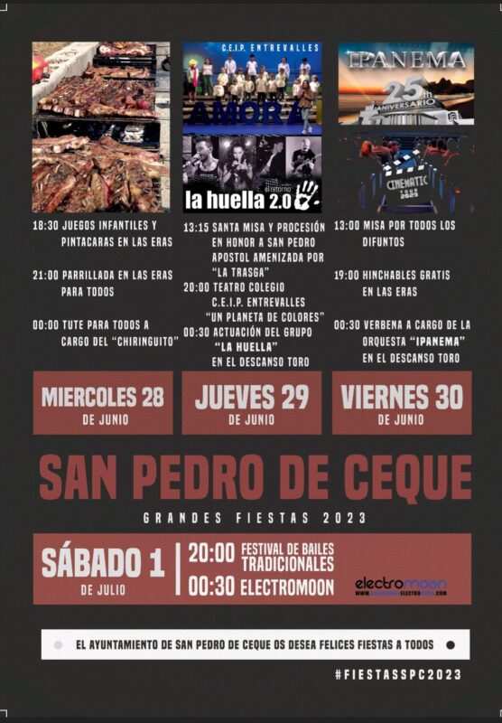 Las habitualmente concurridas verbenas de San Pedro de Ceque contarán en esta ocasión de los festejos patronales con el grupo musical «la Huella 2.0», la orquesta «Ipanema» y la disco móvil «Electromoon».