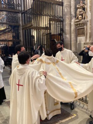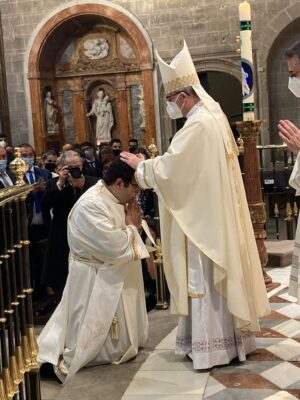 Al terminar, el obispo ha pronunciado la larga oración consecratoria y, una vez concluida esta plegaria de ordenación, ha ungido con el Santo Crisma las palmas de las manos del ordenado, que ha sido revestido con los ornamentos sacerdotales: la estola al modo presbiteral y la casulla. Monseñor Valera le ha entregado la patena con el pan y el cáliz con el vino que han sido presentados en el altar para su consagración, invitando al nuevo sacerdote a conformar su vida «con el misterio de la cruz del Señor».