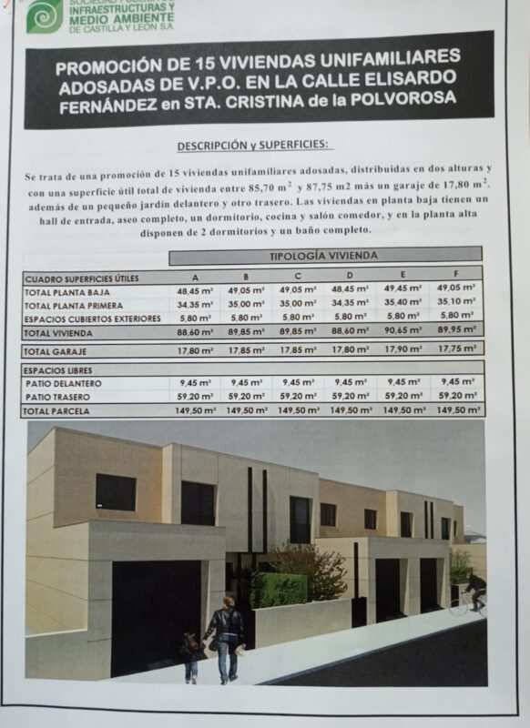 La Junta de Castilla y León, a través de la Consejería de Fomento y Medio Ambiente y de la Sociedad Pública de Infraestructuras y Medio Ambiente (Somacyl) ha sacado a licitación las obras de una promoción de 15 viviendas de protección unifamiliares por un presupuesto de 1.493.022 euros, a realizar en un plazo de 24 meses. Se trata de viviendas unifamiliares adosadas, en tres solares diferentes, que dan a las calles Elisardo Fernández y Felicitas Fidalgo, en la localidad de Santa Cristina de la Polvorosa, como ya se adelantó en Benavente Digital y Televisión Benavente explicando todo el proceso del expediente.