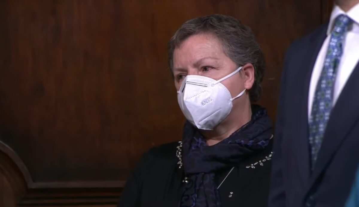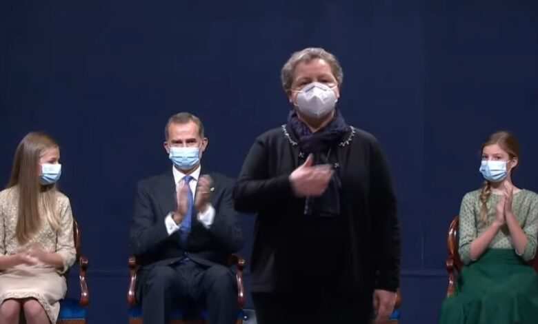 Teresa López Pernía, de Santa Cristina de la Polvorosa, madre de la joven Sara Bravo, de 28 años, la primera médico fallecida a consecuencia de la COVID-19 cuando ejercía su profesión en el Centro de Salud de Mota del Cuervo (Cuenca), recogía el Premio Princesa de Asturias de la Concordia por la labor realizada por los sanitarios del pais.