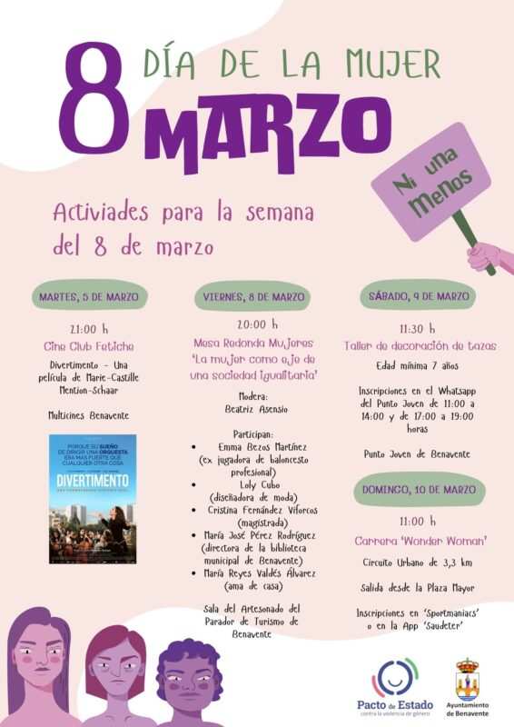 Finalmente, los actos programados desde el Ayuntamiento de Benavente pondrán su broche de oro con la celebración de la Carrera ‘Wonder Woman’ por la igualdad. Una disciplina deportiva donde los participantes podrán realizar los 3,3 kilómetros de recorrido por el centro de la ciudad andando, corriendo o sobre dos ruedas. La inscripción tiene un coste de 5 euros y se podrá realizar a través de la web www.sportmaniacs.com o en la aplicación ‘Saudeter’. Con la inscripción se hará