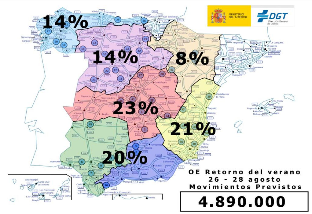 El domingo por la mañana la circulación podrá ser conflictiva en las carreteras que comunican poblaciones del litoral y accesos a zonas de playas en trayectos de corto recorrido, mientras que a partir de primeras horas de la tarde (especialmente entre las 17 y las 23 horas) comenzará el retorno, tanto de los que finalizan sus vacaciones en agosto como de los que han salido a disfrutar del fin de semana, y podrán producirse incidencias con altas intensidades de tráfico en los principales ejes viarios que comunican las zonas del litoral, montaña o segunda residencia con los accesos a las grandes ciudades.
